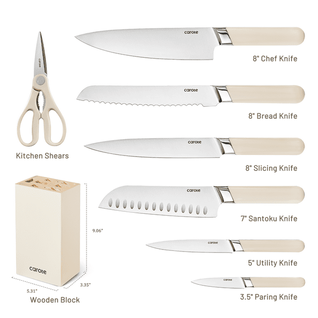 Carote knife set with block includes all the most common kitchen knives, 8" chef knife, 8" bread knife, 8" slicing knife, 7" santoku knife, 5" utility knife, 3.5"Paring knife, as well as a kitchen shears, 7-slot hardwood storage block with nonslip feet.